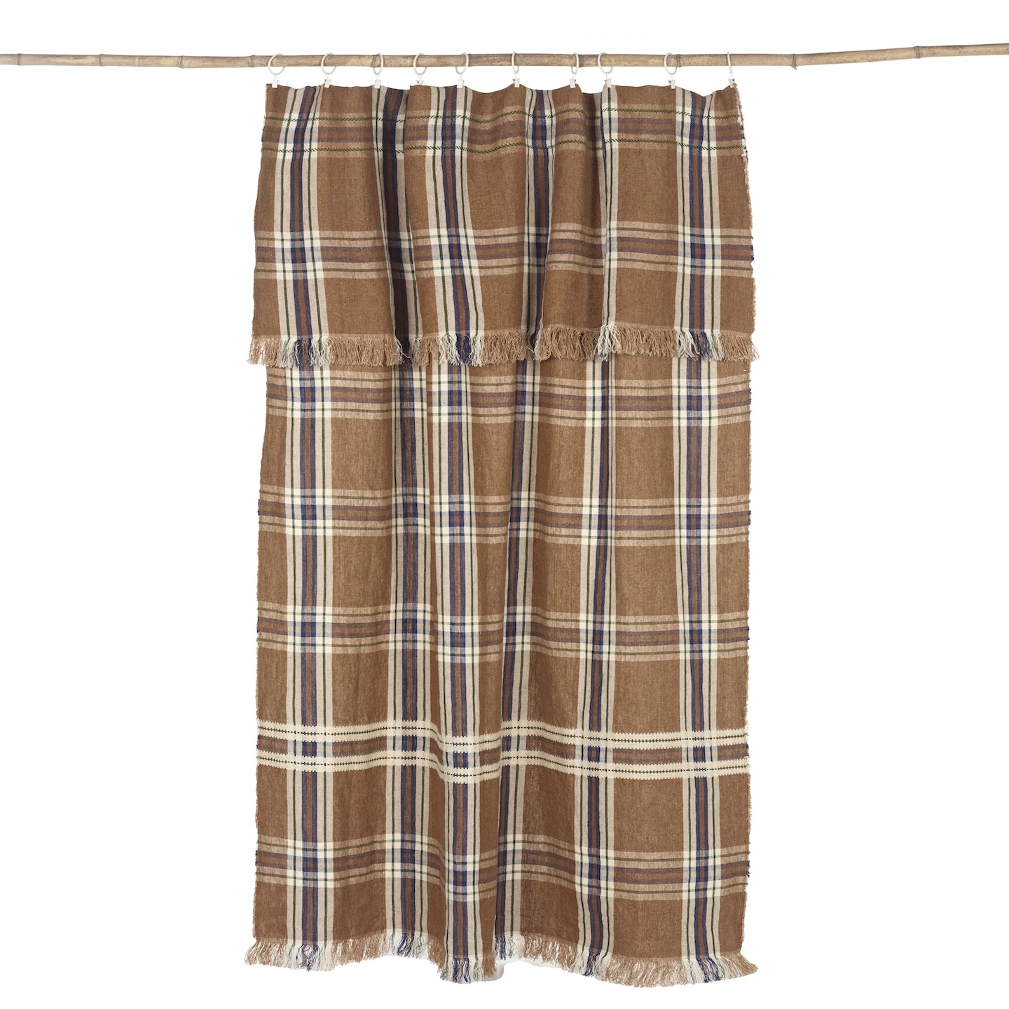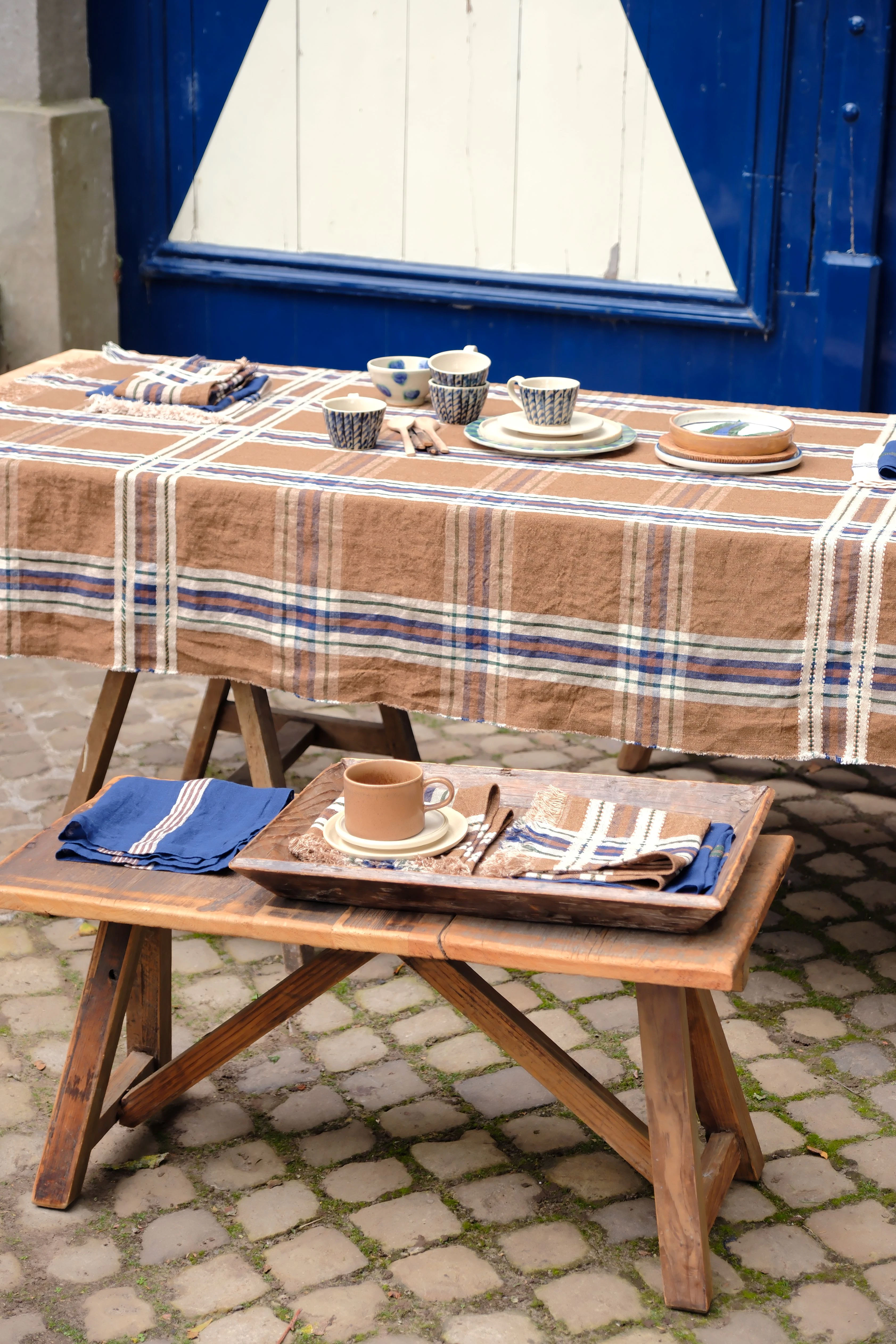 This bold oversized check in indigo, racing green, off-white and sienna brown sits on a ginger-coloured ground.